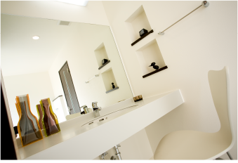 • 洗濯機置場・洗面を2階に配置して、ホテルスタイルの間取りを採用。サンルーム付きのゆったりスペースで寝室から洗面への動線がスムーズです。洗面台は女性に人気の人造大理石カウンターを採用しています。